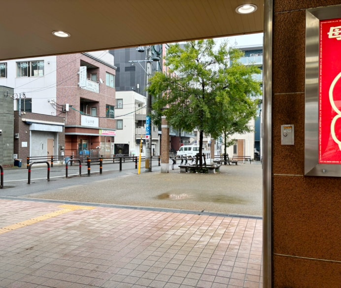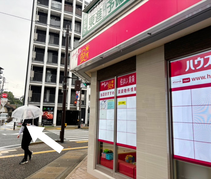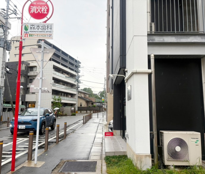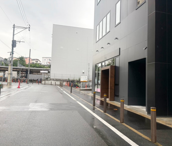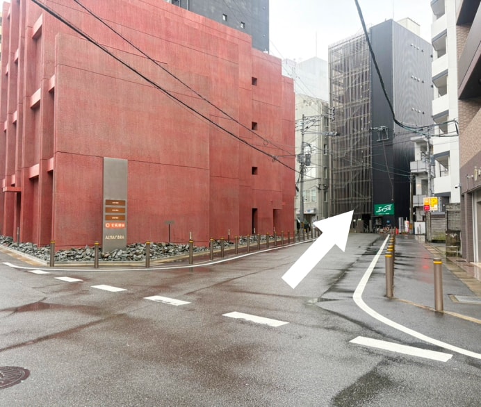 信号を渡ると黒色のビルが見えるので、その左側の道をまっすぐ進みます。