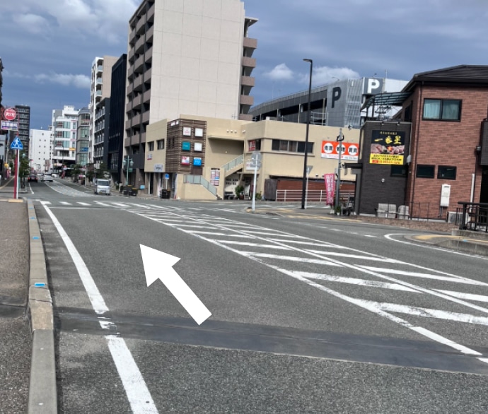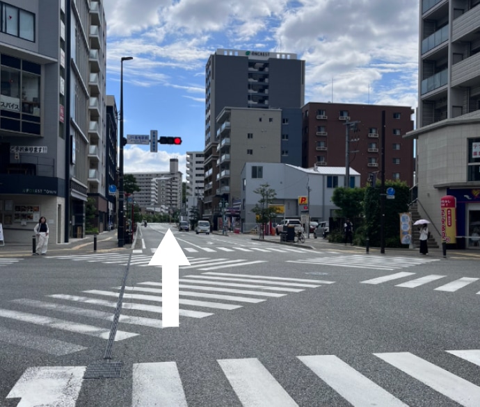 信号を渡ると黒色のビルが見えるので、その左側の道をまっすぐ進みます。