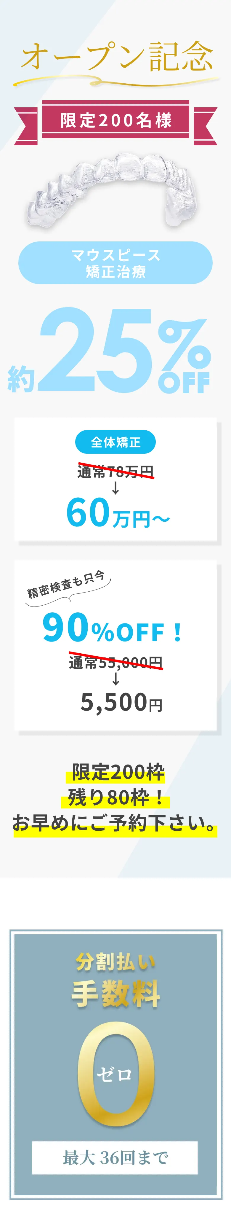 マウスピース装置を使った部分矯正プランになります。費用を抑えてできるだけ綺麗に短期間で仕上げたい方や一度矯正をして後戻りしてしまった方にオススメです。